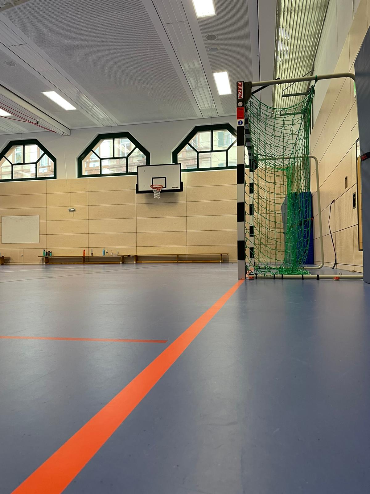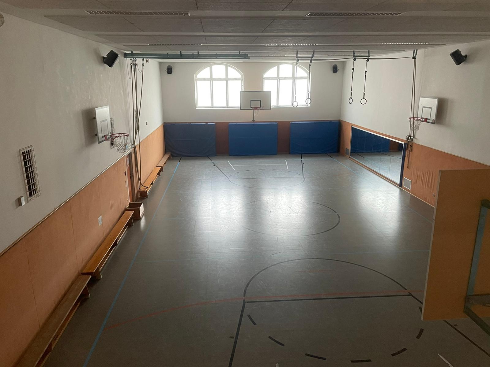 Hier an unserer Schule, haben wir zwei schöne und moderne Sporthallen. Eine große Halle, die sich sehr gut zum Fußball, Handball und Basketball spielen eignet. Es gibt an den Wänden vier mittelgroße Basketballkörbe, und an der Decke hängen zwei große Körbe. Es gibt auch zwei Handball-Tore die sich sowohl zum Fußball als auch zum Handball spielen gut eignen. Wie es in vielen anderen Sporthallen üblich ist, stehen an der Wand vier Banken und es gibt auf beiden langen Seiten Lager/-Geräteräume. Es gibt auch zwei Notausgänge, einer führt nach draußen zum Haupteingang der Schule und der andere führt ins Treppenhaus des Neubaus. Die Halle wurde nach zwei Jahre langer Arbeit erfolgreich renoviert.